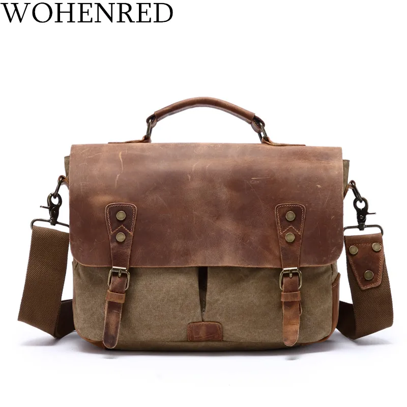 Discount Men Briefcase Leather Canvas Laptop Bag Satchel Male Messenger Shoulder School Work Bag Vintage Cas